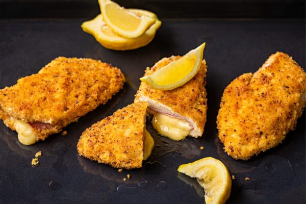Filet de poulet façon cordon bleu au lard paysan fumé à l’emmental fondue,comté,poêlée de légumes de saison,riz nacré aux petits oignons,crème de potimarron,tartare de tomates confites
