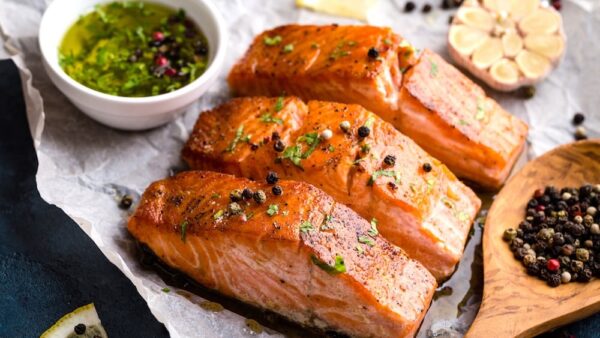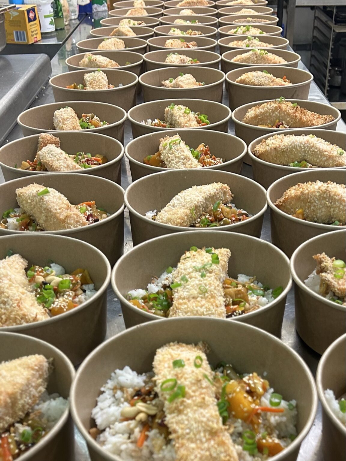 Saumon frais pané au panko,soja,sésame,riz vinaigré aigre doux,légumes rôtis,oignons grillés,crème de coco au beurre de cacahuète et citron vert