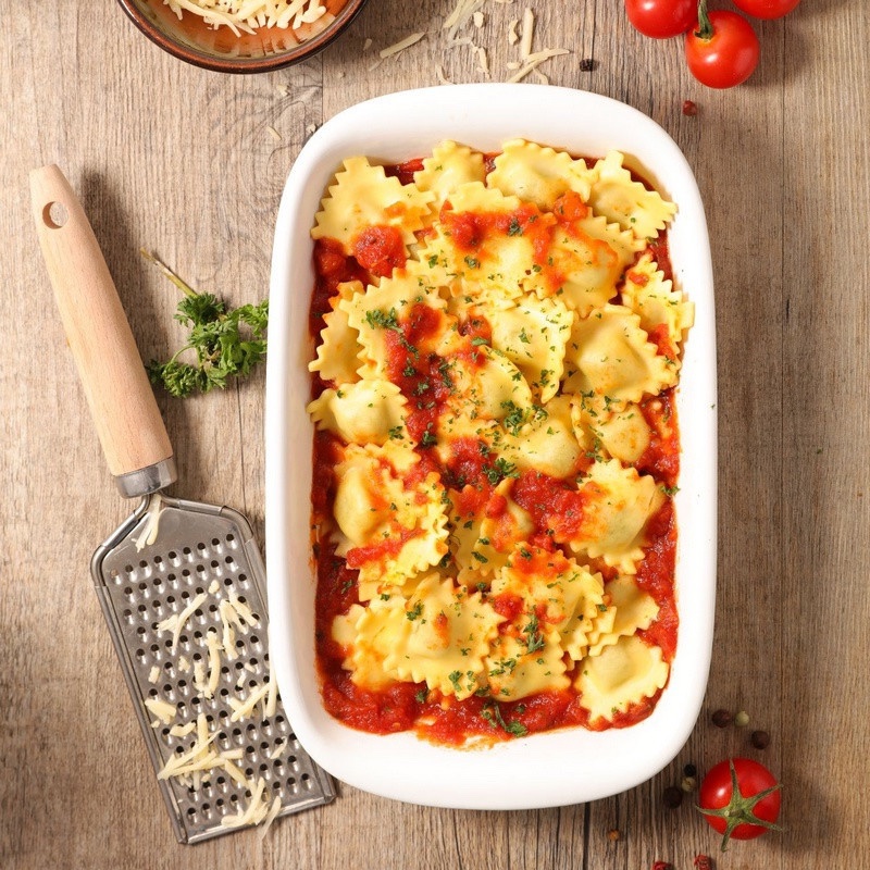 Gratin de raviole à la bolognaise,saucisse label rouge,mozzarella et petits légumes persillés,sauce tomate arrabiata au basilic frais,huile fumée