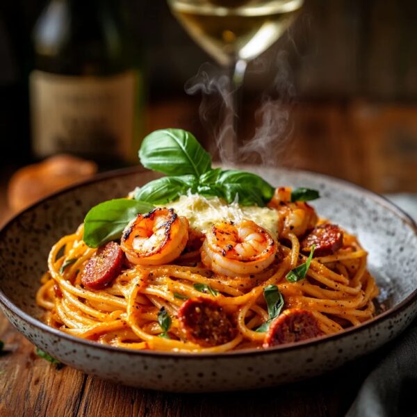 Linguines fraîches crémeuse aux grosses crevettes sauvages et chorizo,lait de coco infusé au safran,parmesan,légumes de saison rôtis,ciboulette fraîche