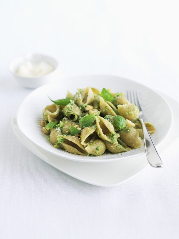 Conchiglionis de couleurs(légumes)au pesto alla Genovese,cuisse de poulet du Gers rôtie,fromage frais ,