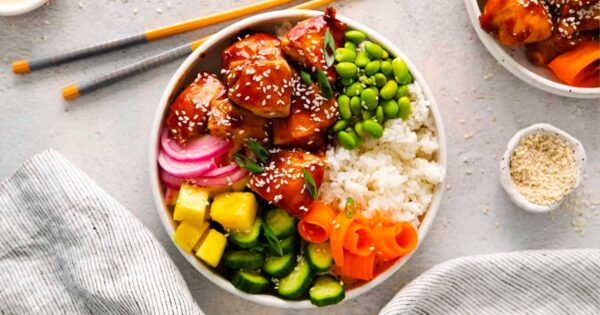 Poké FOD au saumon mariné à la Japonaise ou poulet pané corn flakes,salade de choux blanc vinaigré au sésame/menthe/prune jaune/,riz basmati aux cebettes,sauce soja/citron et avocat en tartare
