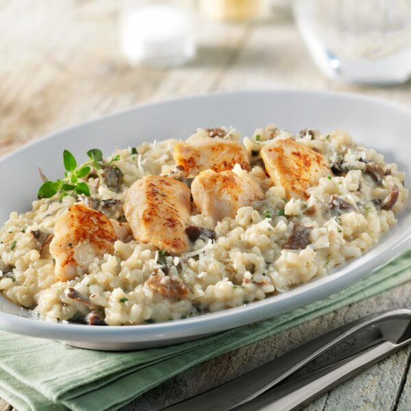 Risotto crémeux au poulet,parfum de sauge,sauce légère au chorizo(sans conservateurs),parmesan,légumes rôtis,coulis persillé