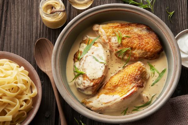 Suprême de volaille label rouge rôtie,morilles et foie gras,gratin dauphinois au Cantal,marrons et légumes de saison,persillade et sauce volaille maison.
