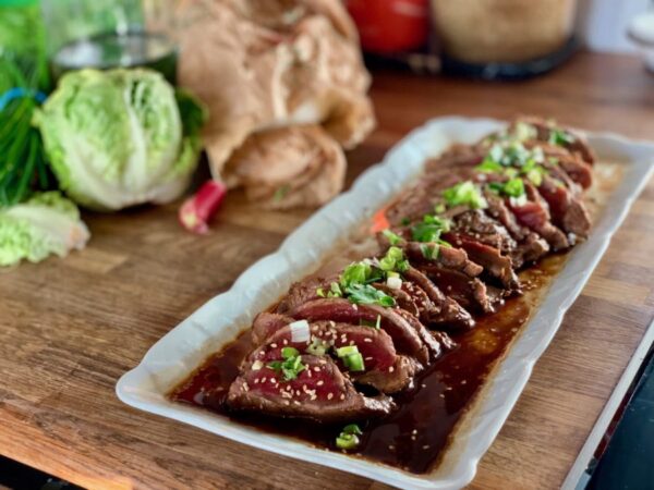 Bœuf tataki à la Japonaise,soja,citron vert,cebette,sésame,salade de wakamé,riz thaï parfumé,nectarine de Région,petite salade fraîcheur