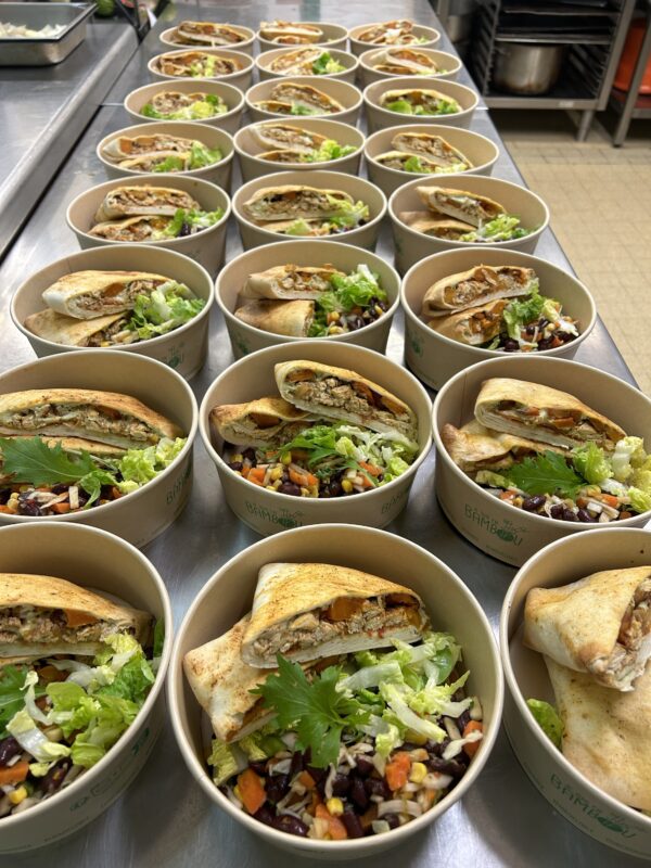 Wrap gourmand façon mexicaine et toasté,au bœuf frais haché aigre doux ,oignons confits,fromage frais,salade gourmande aux œufs durs,haricots rouge et patate douces confites